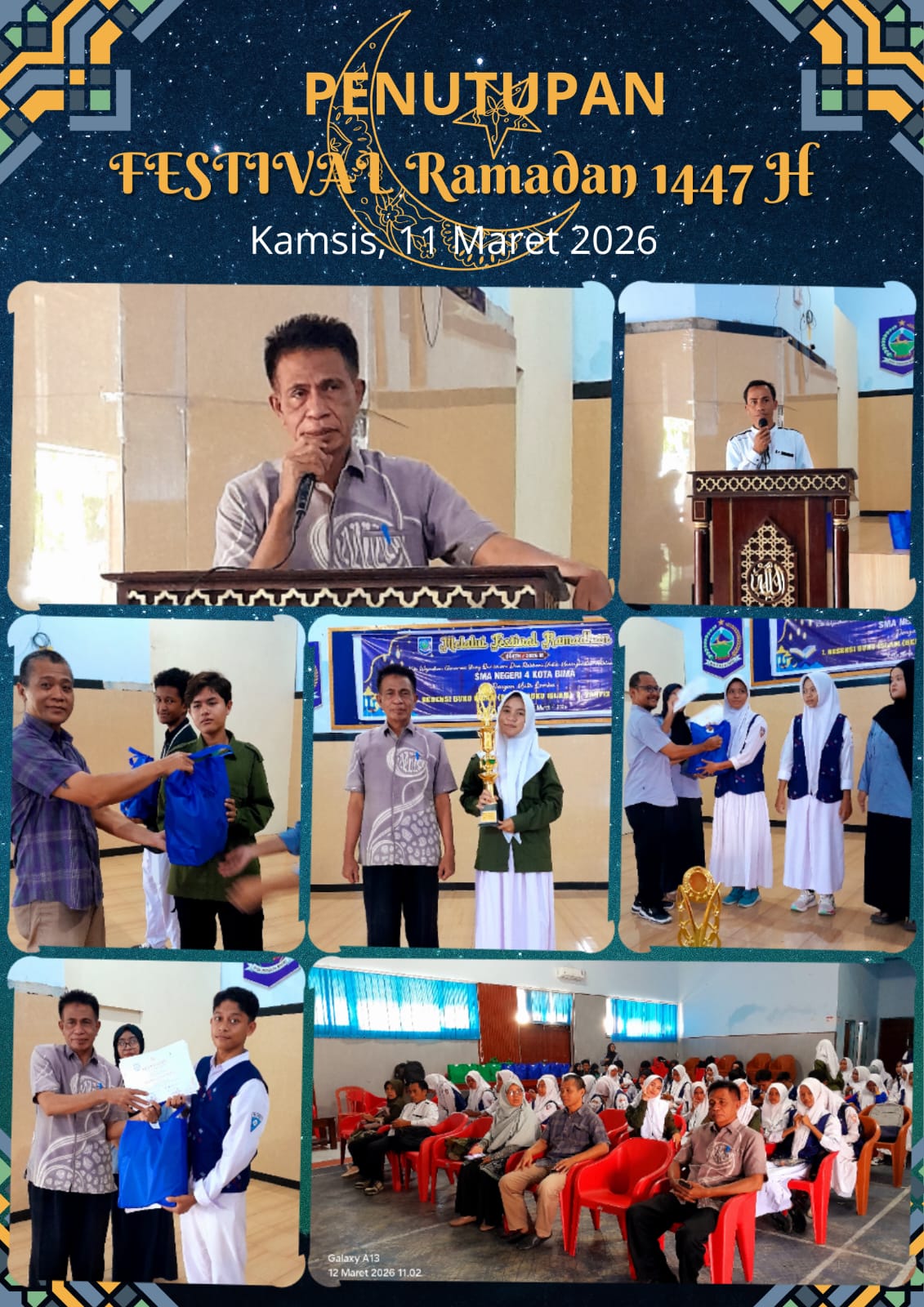 Kamis, 11 Maret 2026, Aula SMAN 4 Kota Bima kembali dipenuhi suasana penuh kehangatan dan semangat saat berlangsungnya acara penutupan resmi Festival Ramadhan 1447 H/2026 M. Acara ini dipimpin langsung oleh Kepala Sekolah, Bapak Imran, S.Pd., MM, yang menyampaikan ucapan terima kasih dan penghargaan kepada semua pihak yang telah berpartisipasi dalam menyukseskan kegiatan ini.
