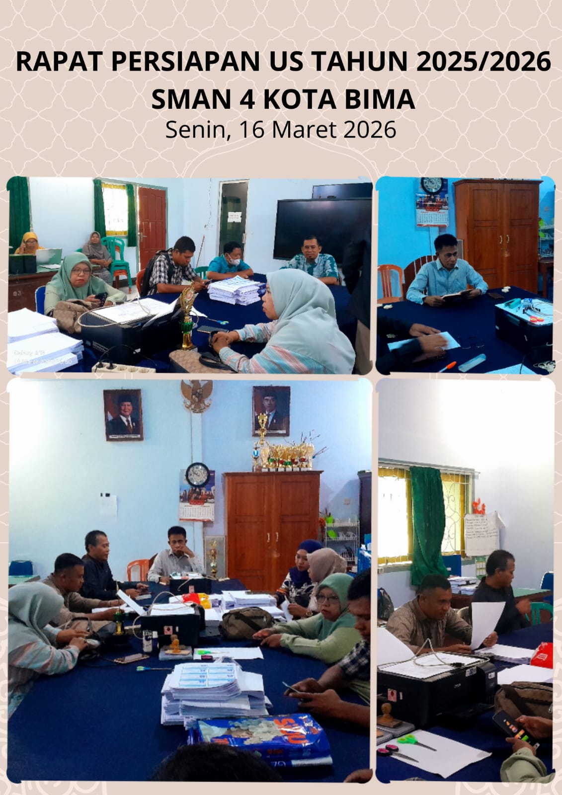 Pada hari Senin, 16 Maret 2026, SMAN 4 Kota Bima menggelar rapat persiapan Ujian Sekolah Tahun Pelajaran 2025/2026 berlangsung di Ruang Wakil Kepala Sekolah. Rapat ini dihadiri oleh seluruh panitia ujian dan dipimpin langsung oleh Kepala Sekolah, Imran, S.Pd.,M.M.